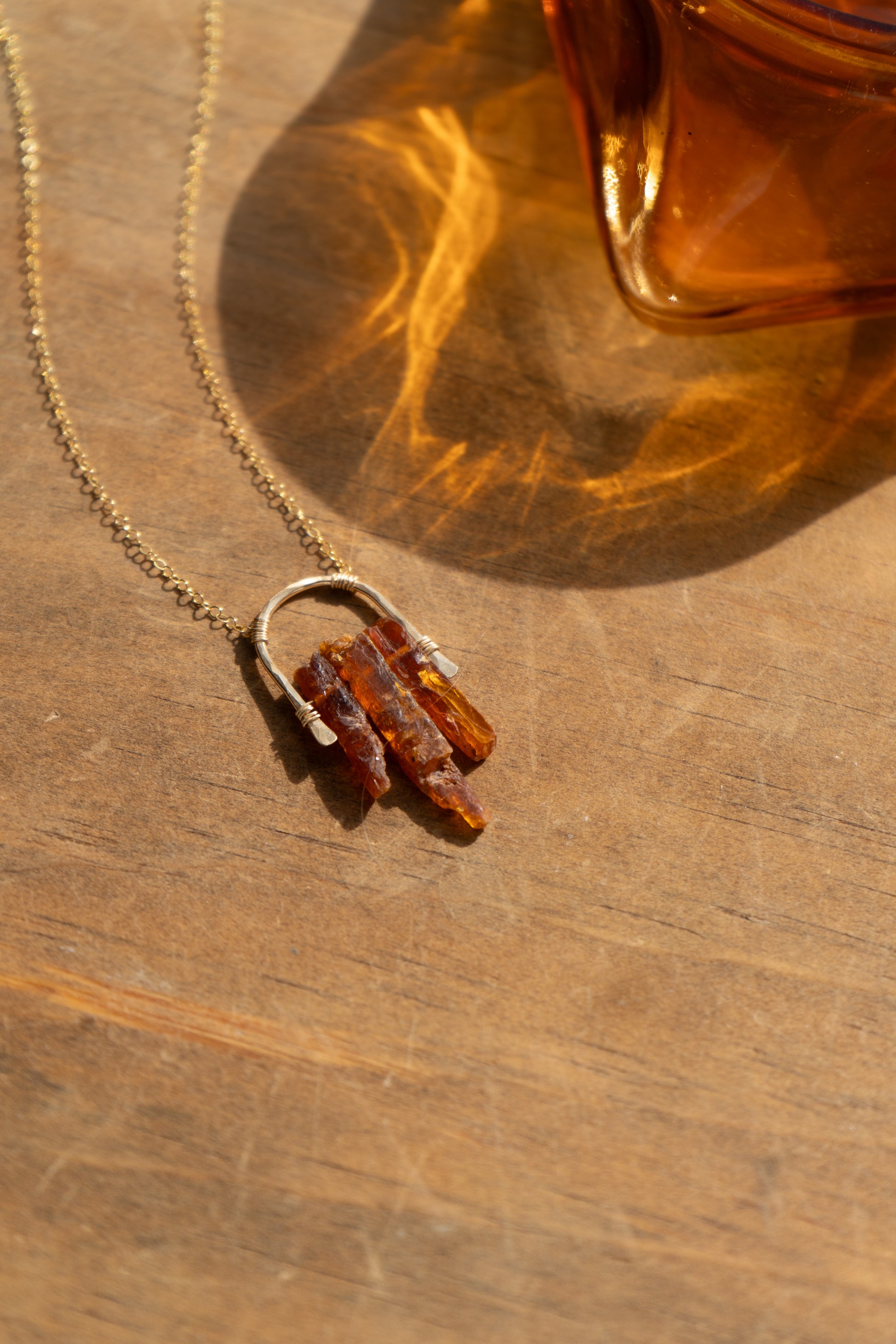 One of the coolest necklaces, a rich orange aragonite piece. Made with gold-fill and a 16" chain.