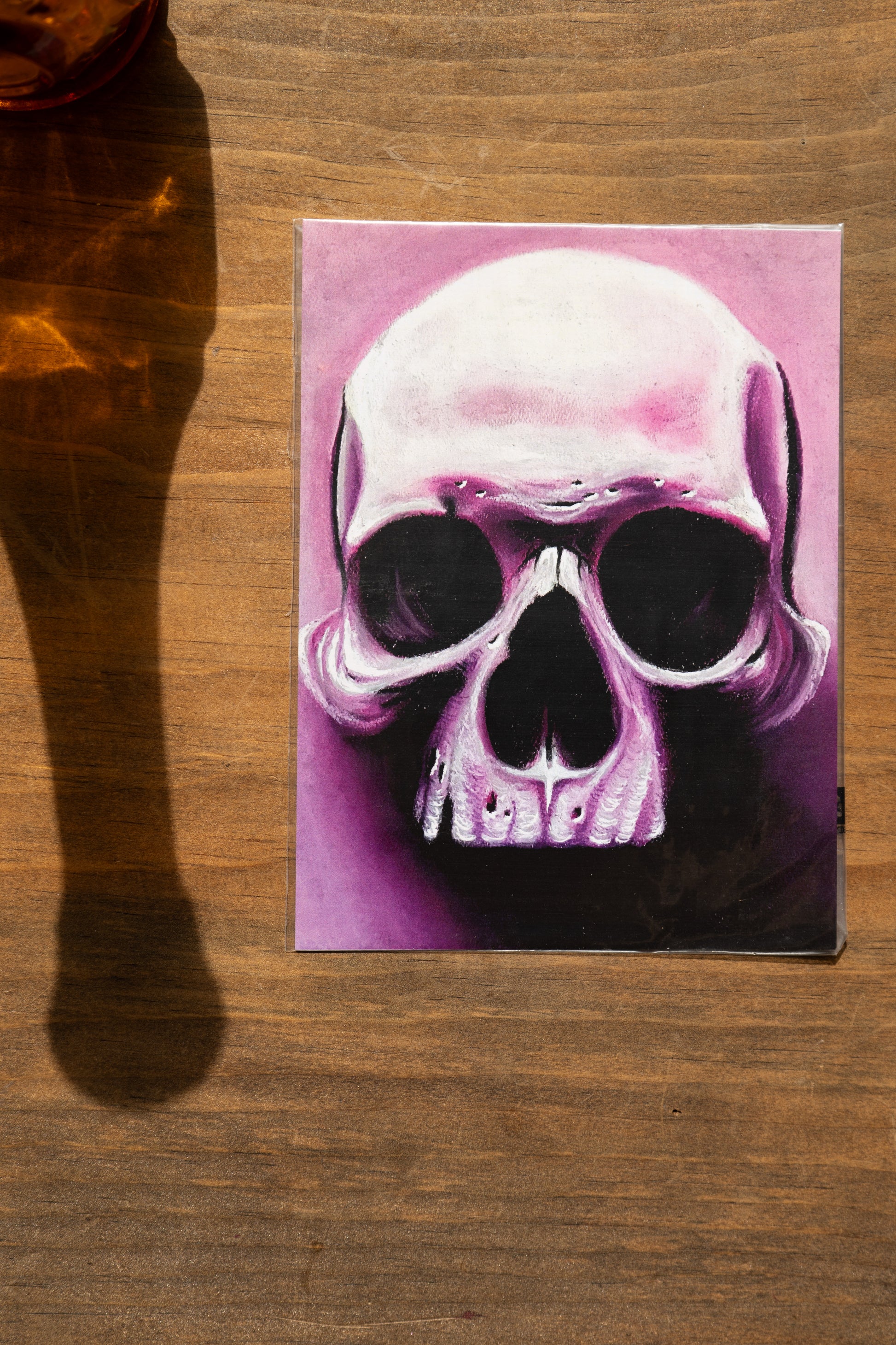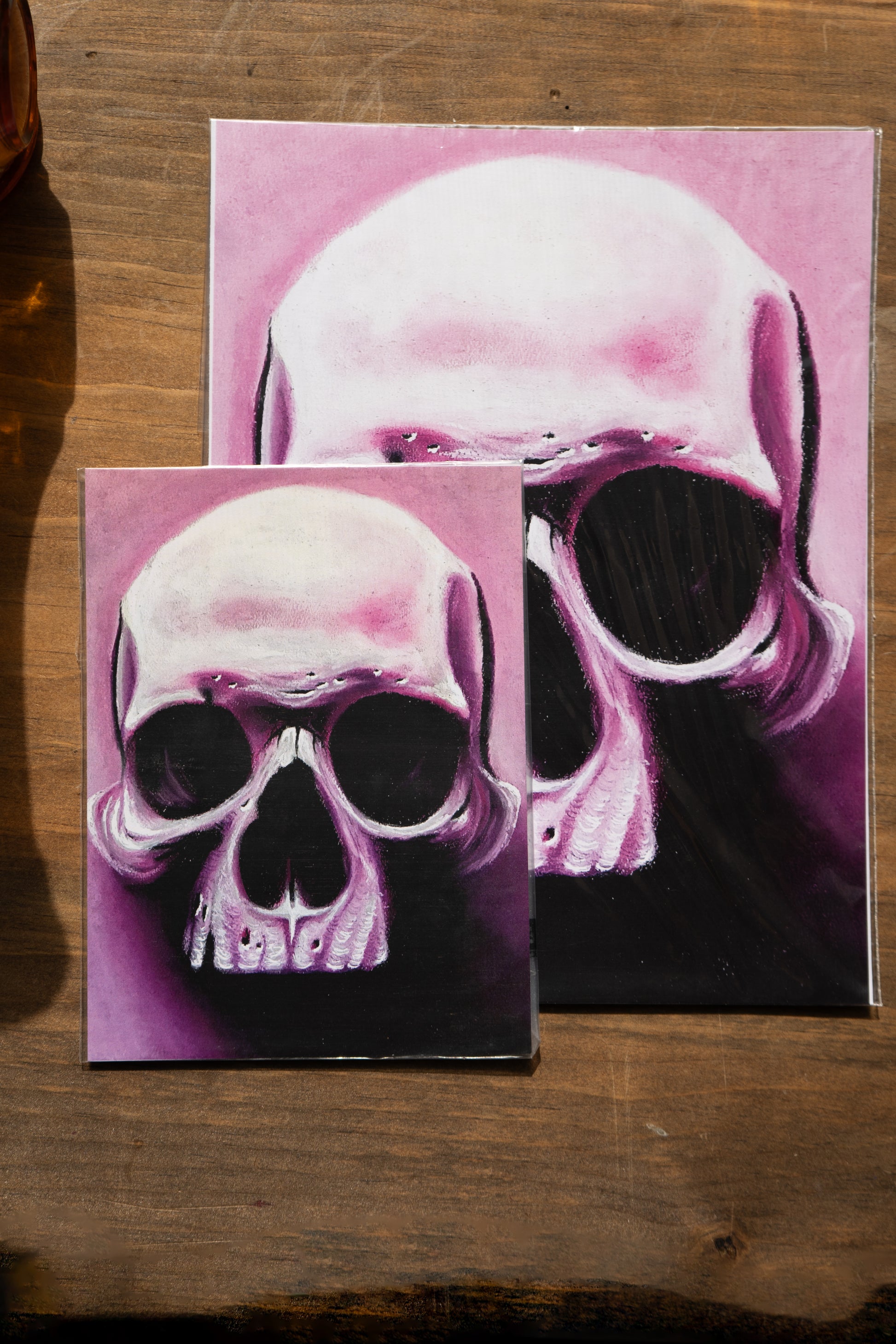 A bold pink skull rendered in soft, vibrant pastels, created as a companion to the Pink Moon. The rich texture and vivid color give it depth and presence. Together, they explore contrasts—life and death, light and shadow—while this piece also stands alone as a striking statement.