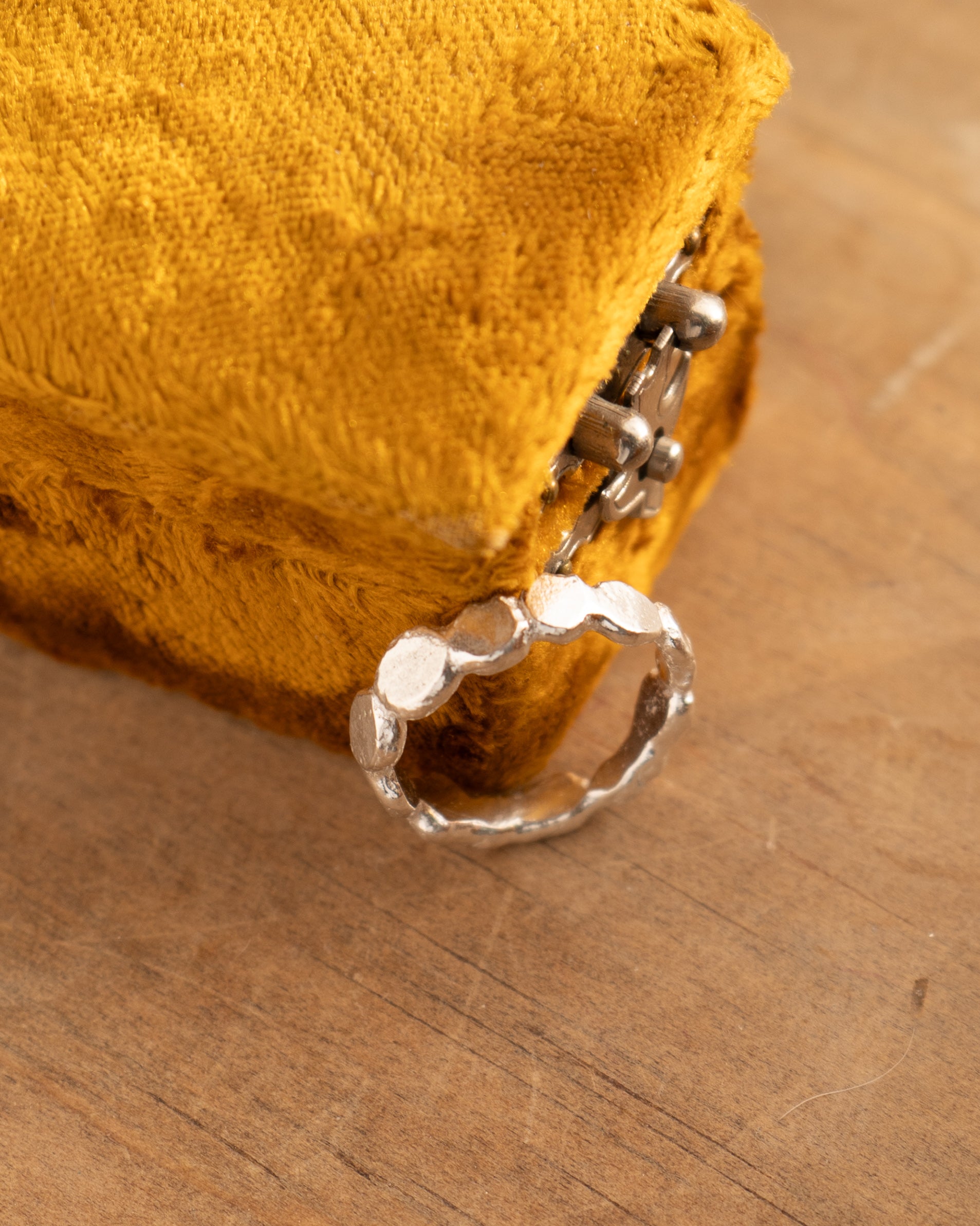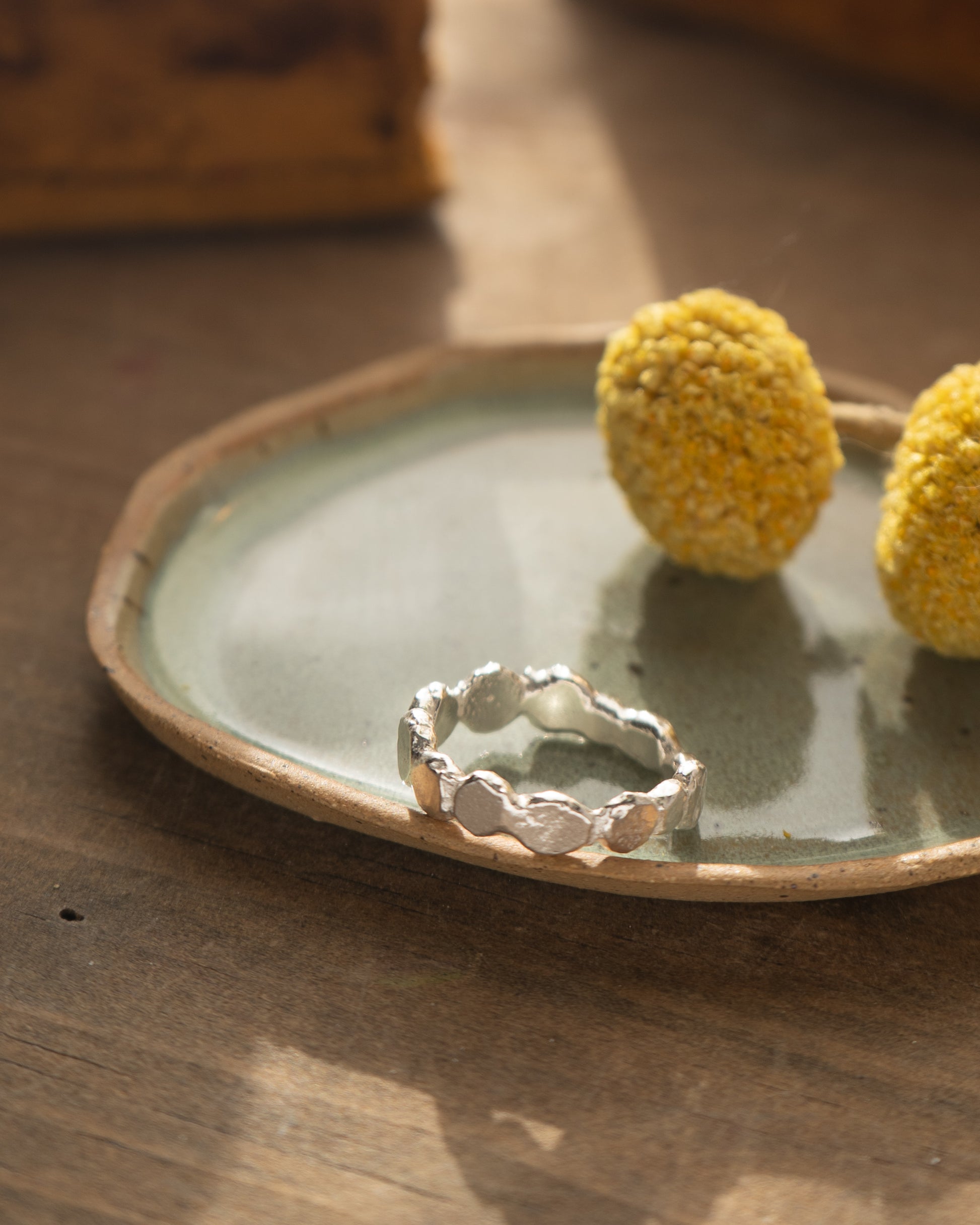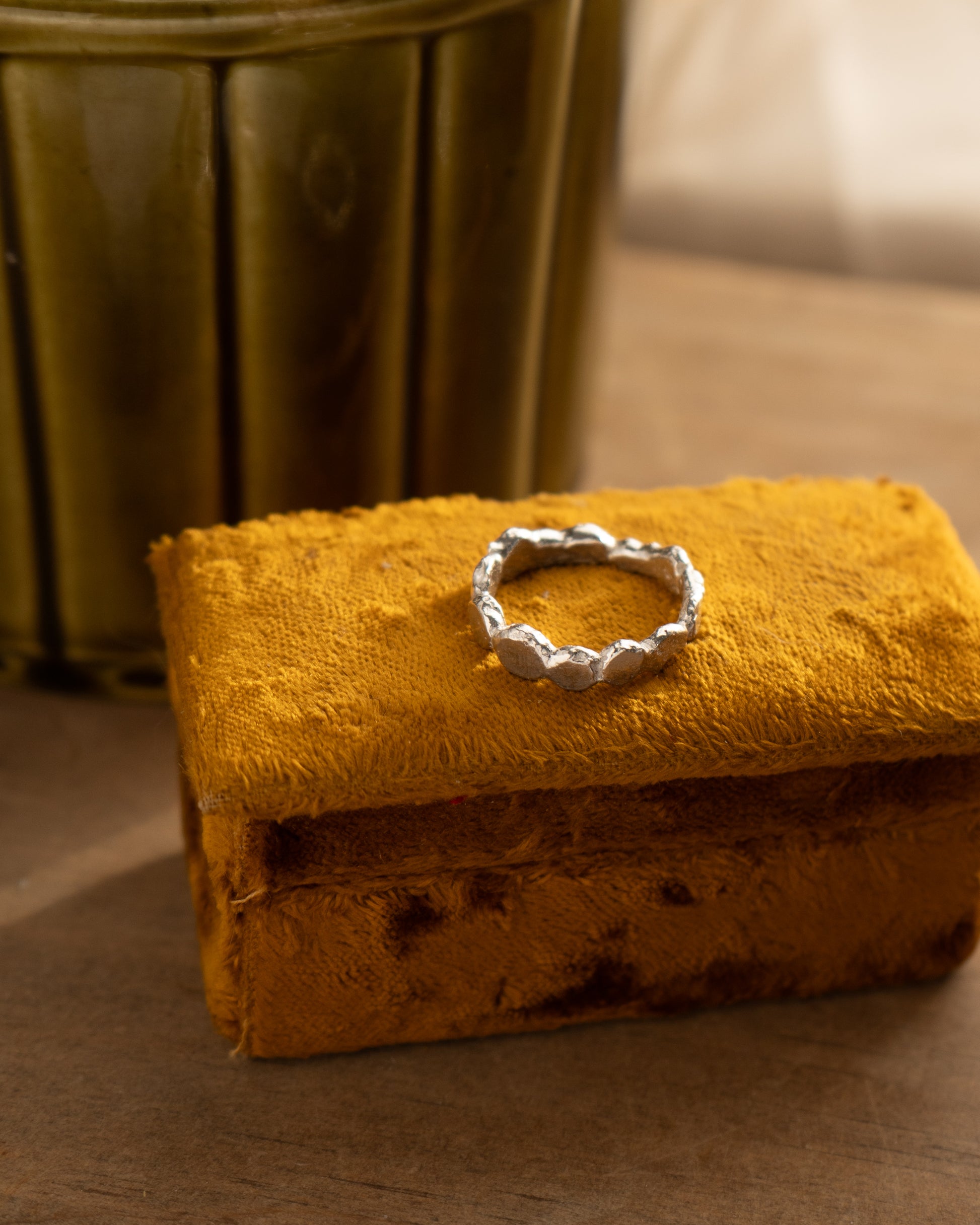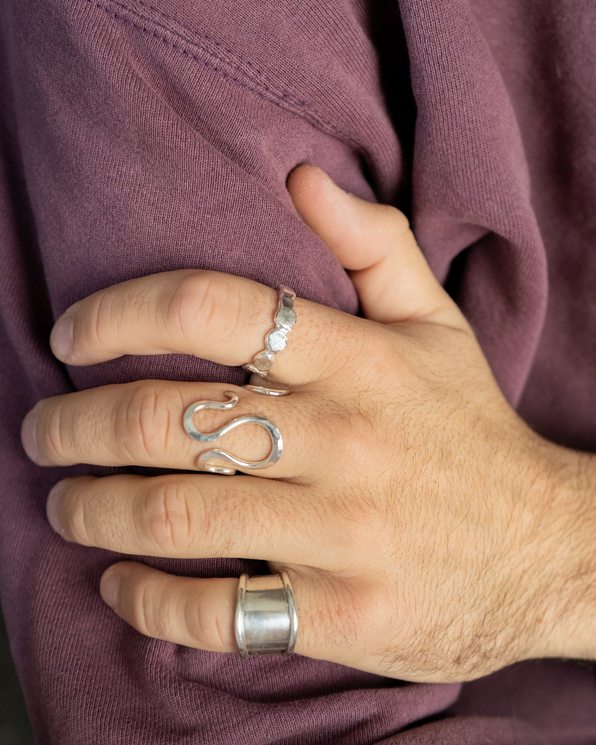 A boulder is a large, naturally formed rock known for its steady presence and simple strength. The boulder band is handmade from recycled .925 sterling silver, each ball of silver gets gently flattened to form a soft, stone-like shape. No two rings are the same making each ring one of a kind.