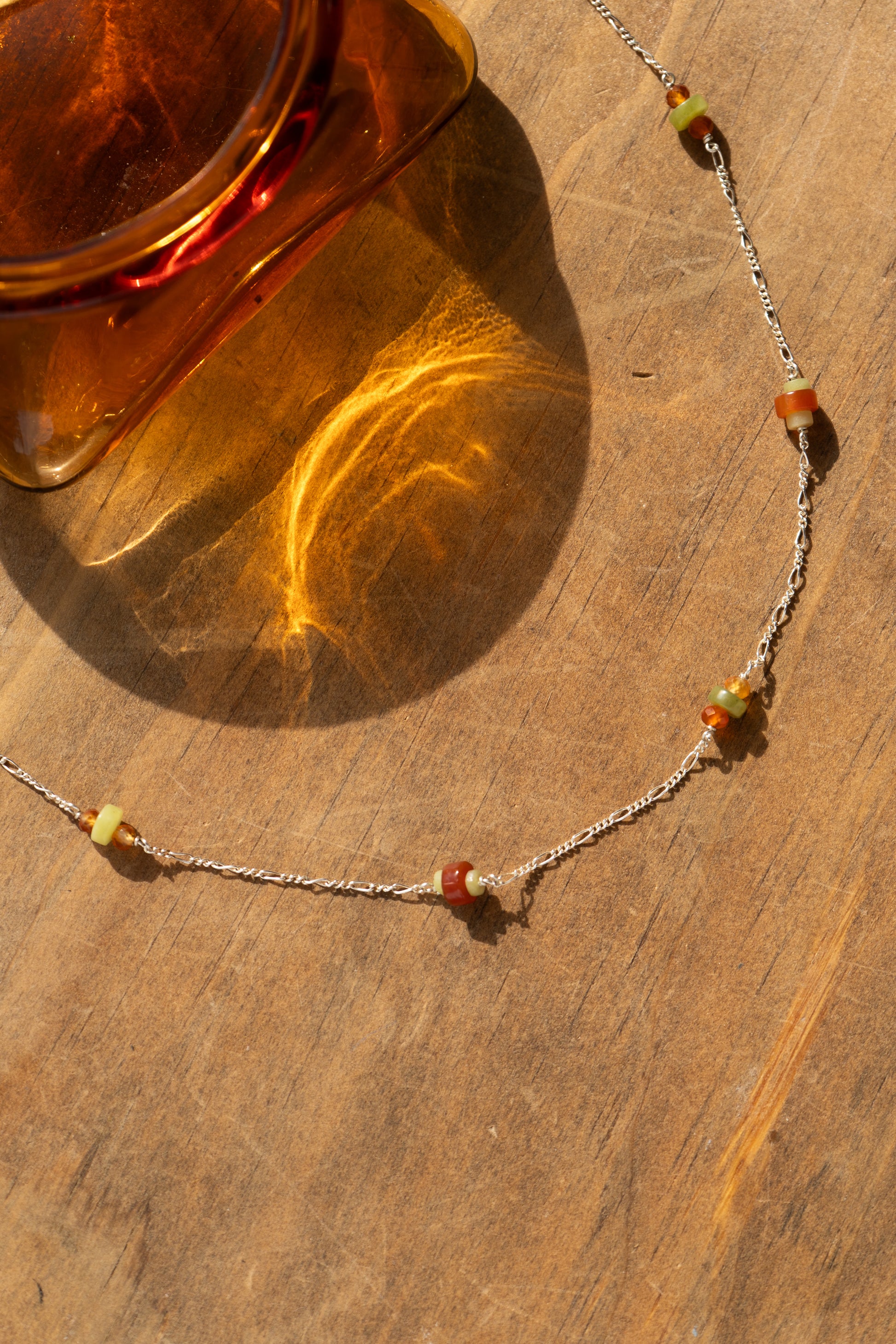 A Figaro chain with Carnelian and Jade sprinkled throughout! Only one available in sterling silver 16".