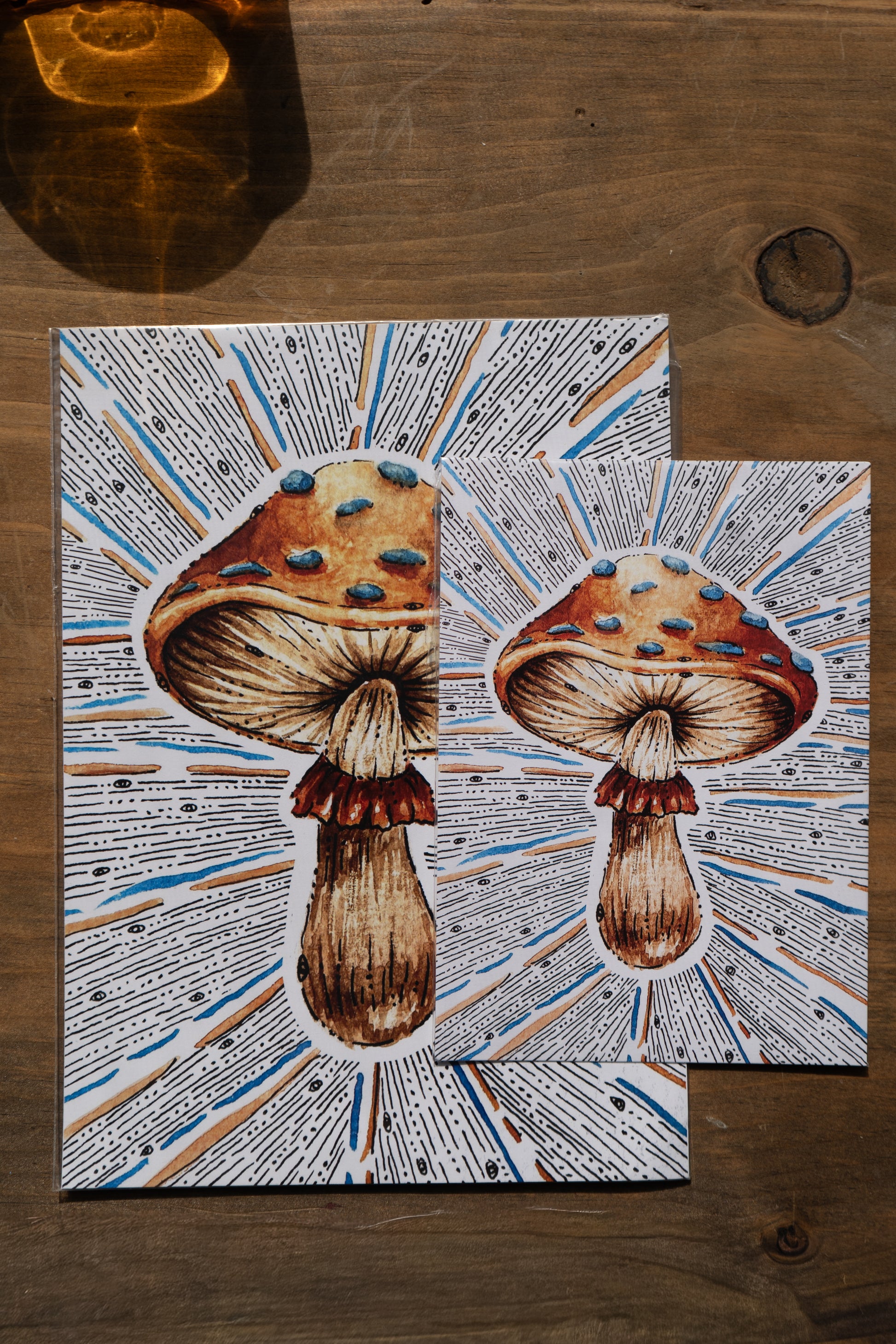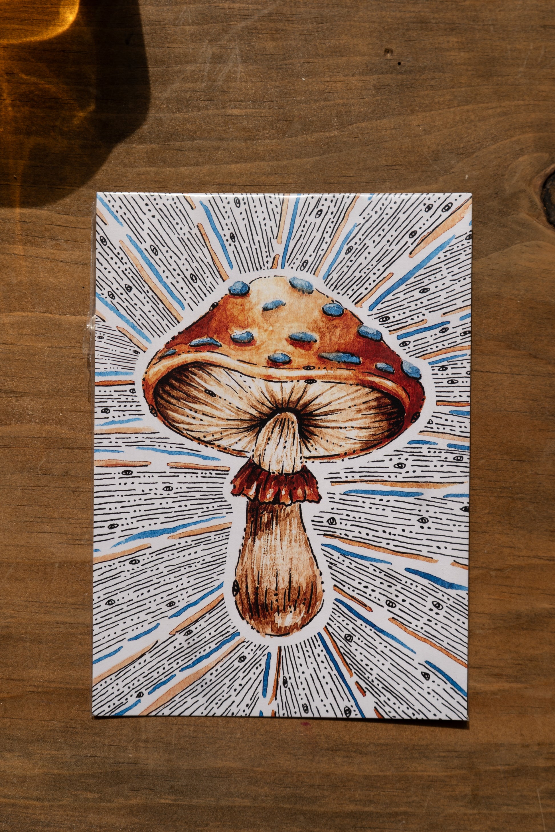 A watercolor mushroom in vibrant blues and oranges, with tiny eyes hidden throughout the linework. Part of a three-piece set honoring Earth Day, it invites you to slow down and notice the small wonders all around us—reminding us that the earth is always watching, always alive, and full of hidden life.