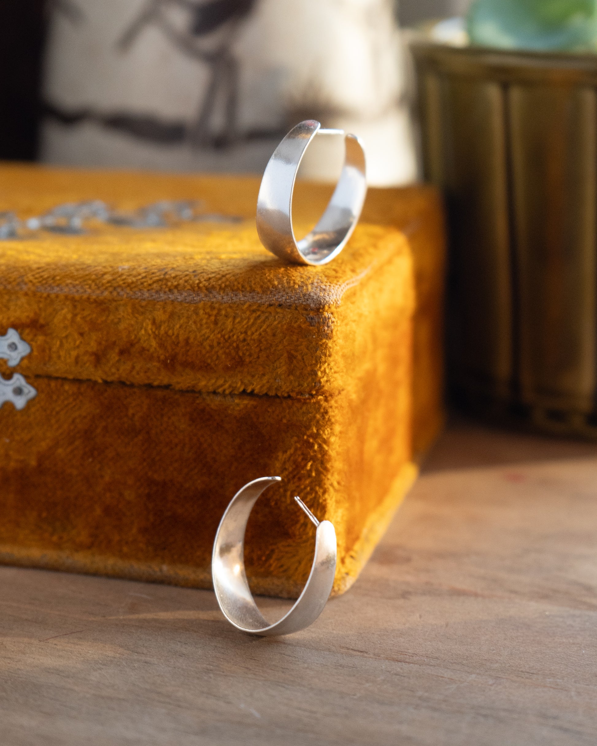 The Horizon hoops are a sleek take on the saddle shape, handcrafted in .925 silver and hand forged into their smooth, domed form. Bold yet refined, they are slim enough to stack but strong enough to stand out, making them an easy everyday statement.