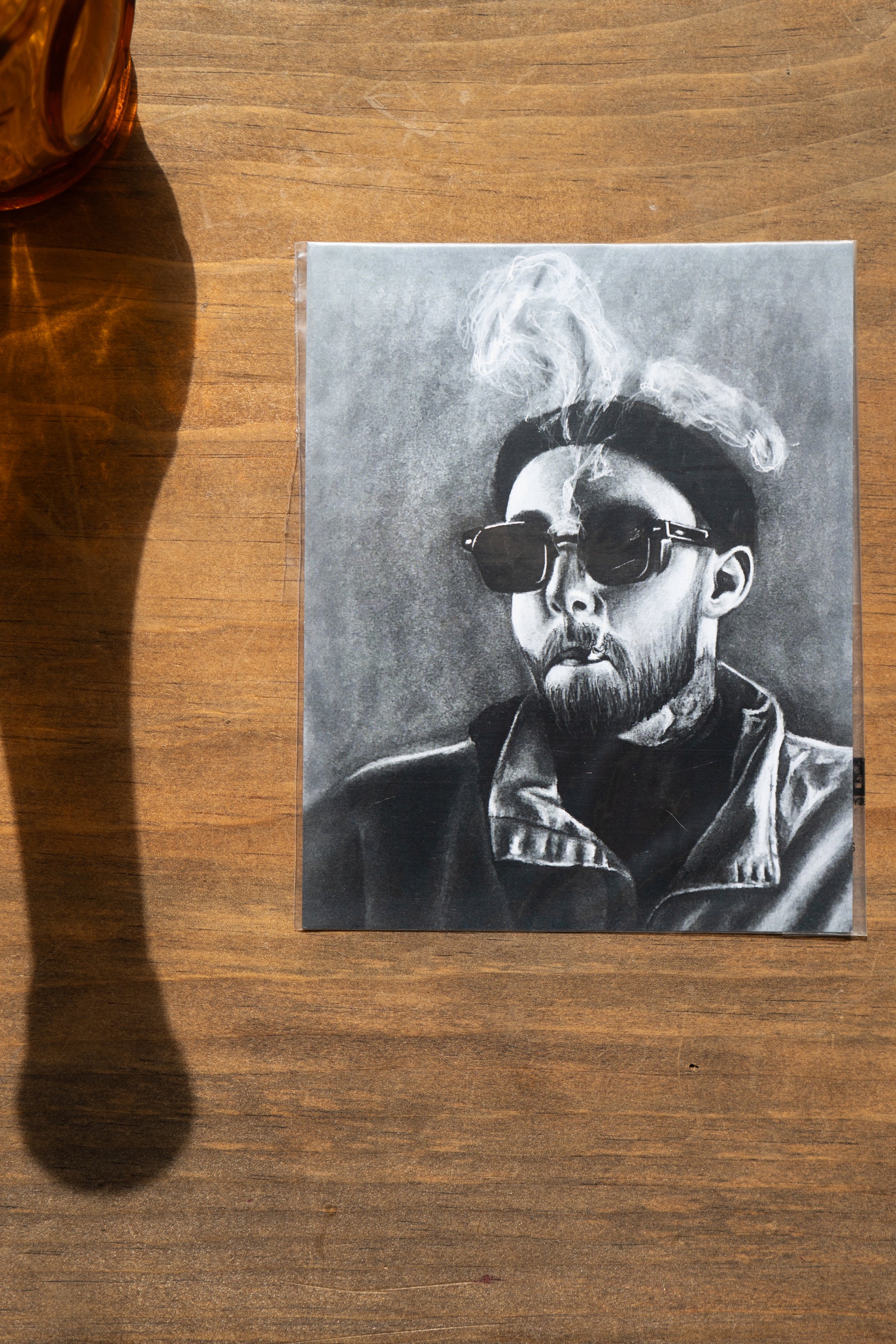 A black and white charcoal portrait of Mac Miller, soft and reflective. The piece echoes the calm and depth of his music—tender, searching, and full of emotion. A quiet tribute to his voice and spirit.