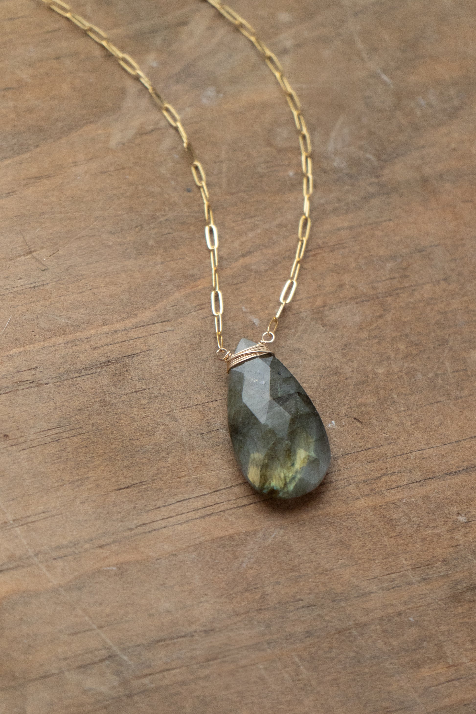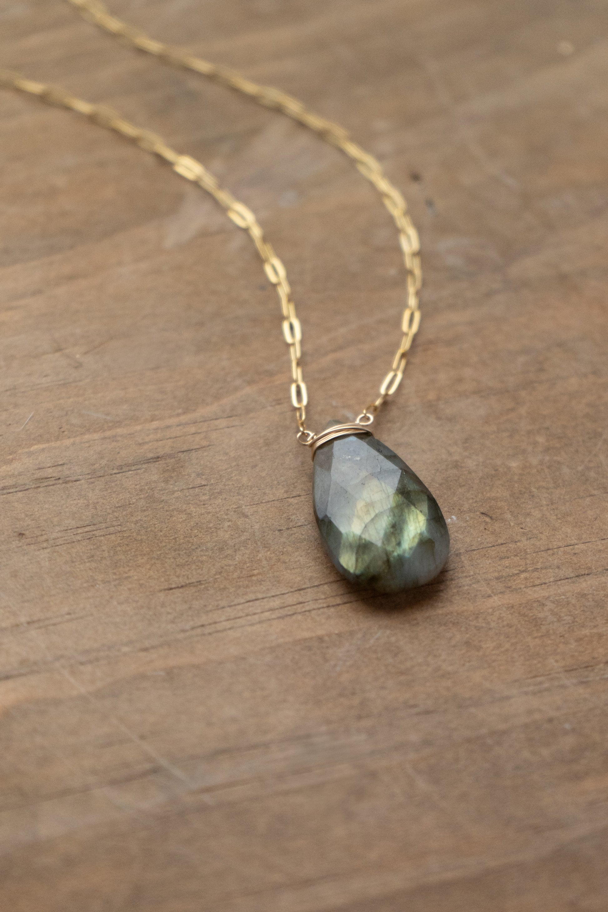 A gorgeous rainbow of labradorite flash. Wire wrapped with gold-fill on an 18” chain.