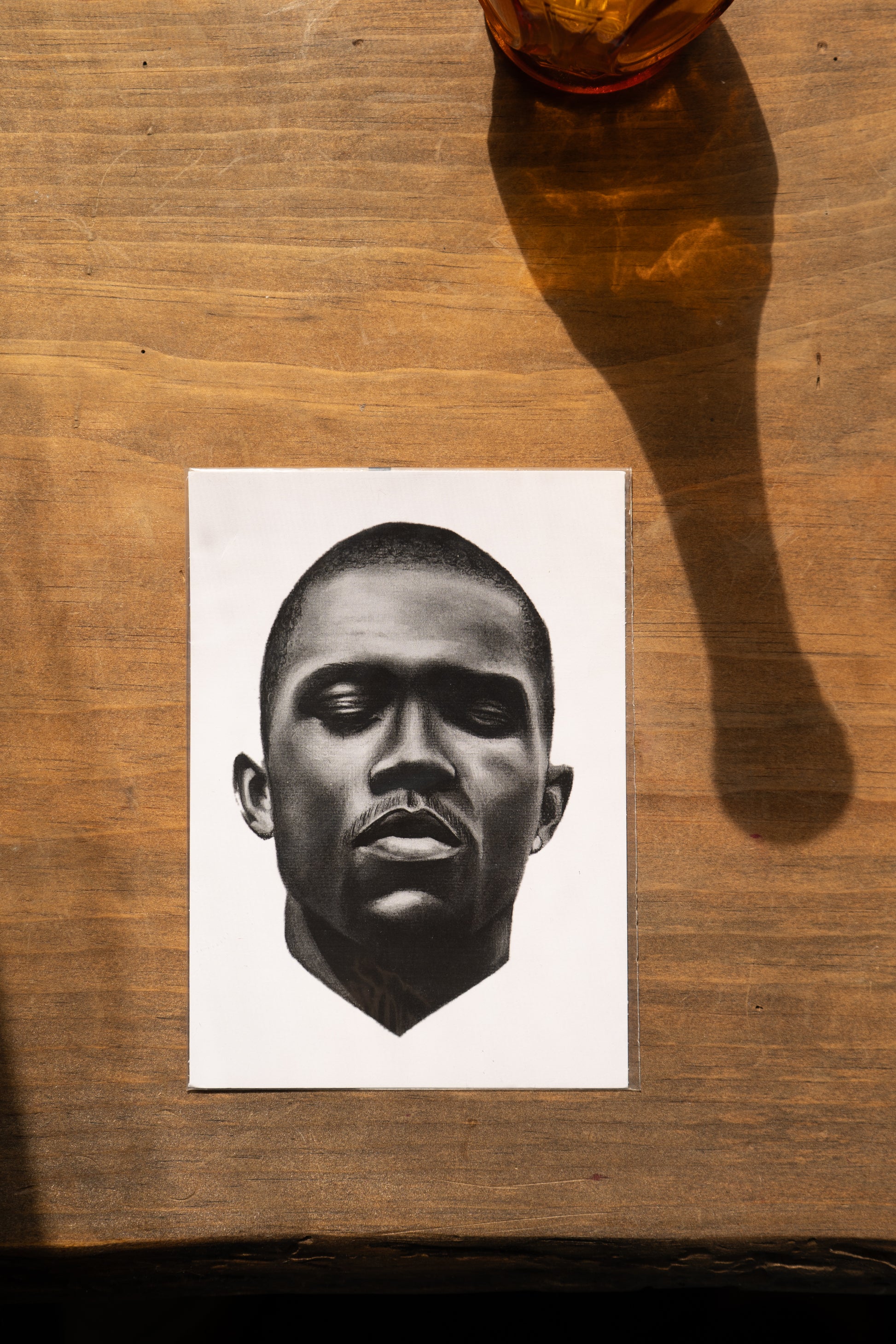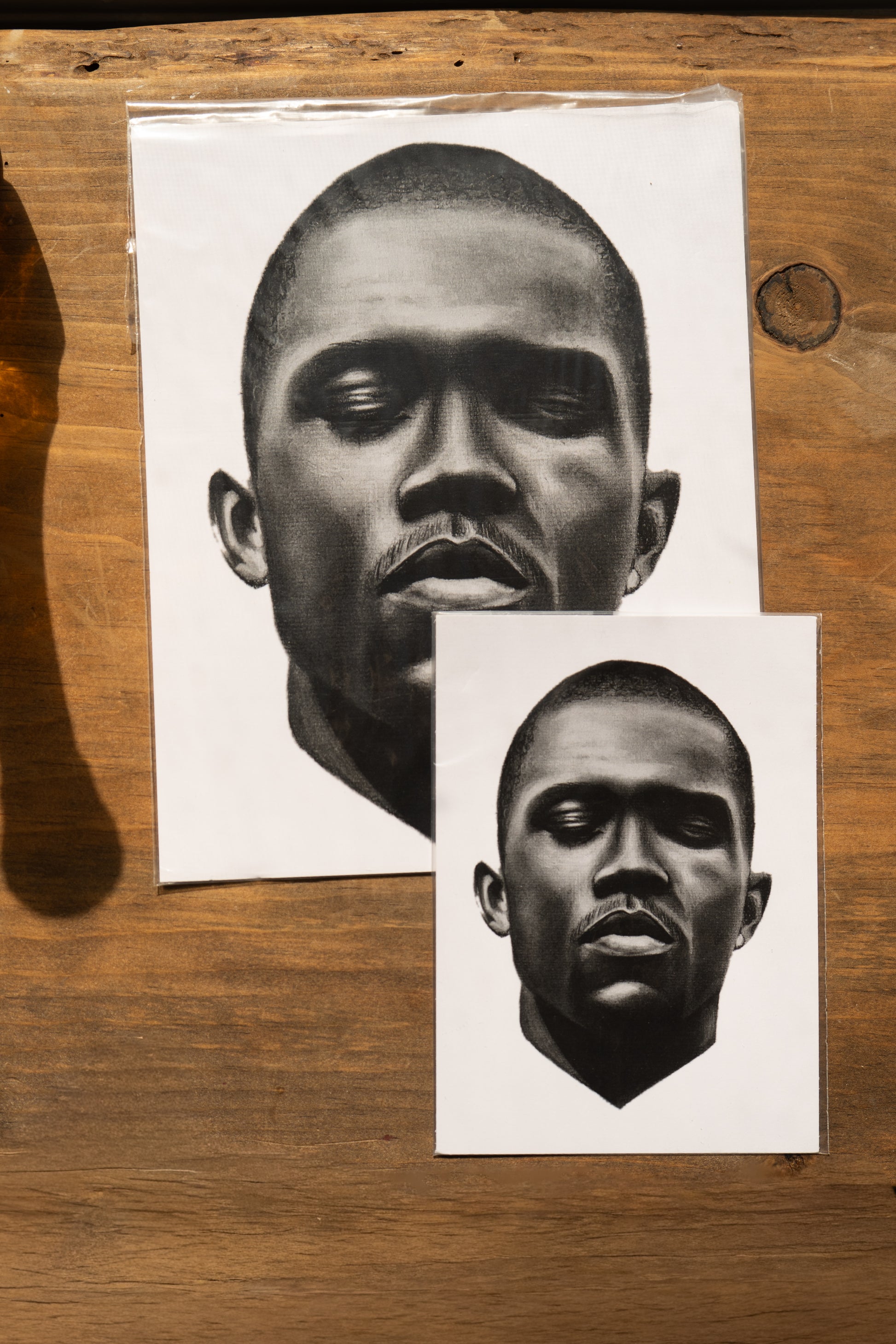 A black and white charcoal portrait of Frank Ocean, eyes closed, almost like he’s drifting inside his own music. The soft, airbrushed look mirrors the way his songs feel—intimate, emotional, and layered. It’s a piece that reflects the quiet depth he brings to every lyric and melody.