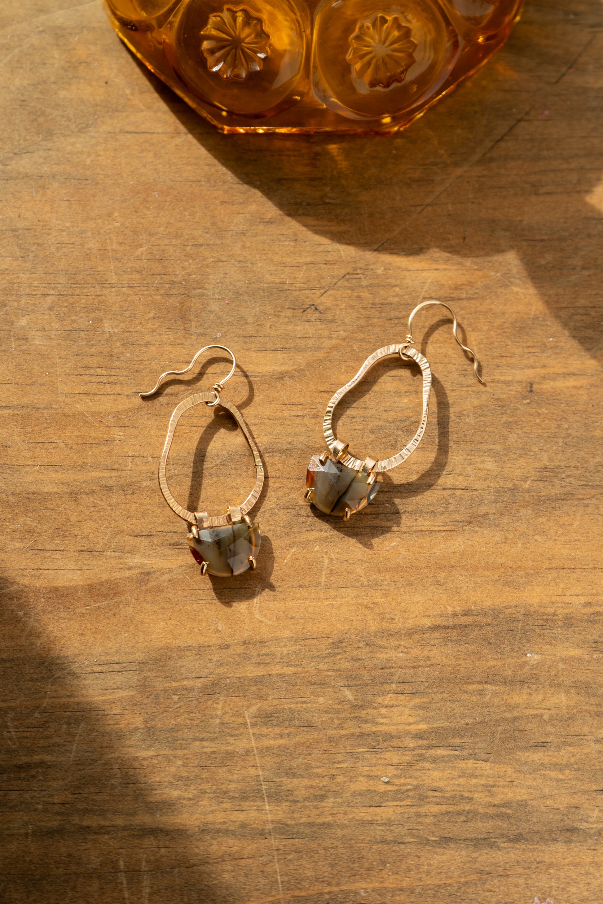 Super fun textured hoops with a half circle Montana agate swinging from the bottom.