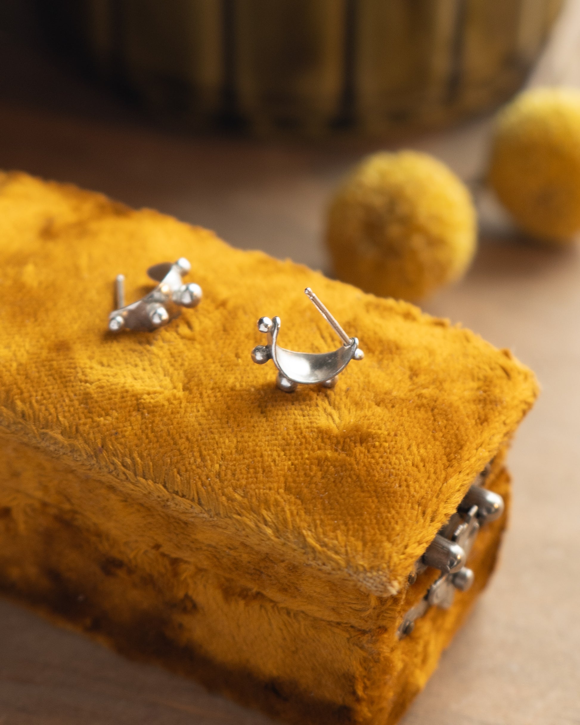 These Pebble Trail Hoops are handcrafted from .925 sterling silver, beginning with a small domed hoop that forms a smooth, elegant silhouette. Along the center, recycled silver balls of varying sizes are carefully placed, creating a rhythmic trail that catches the light from every angle. Inspired by the gentle patterns found in nature, these hoops balance a sculptural, slightly industrial feel with subtle movement and texture.