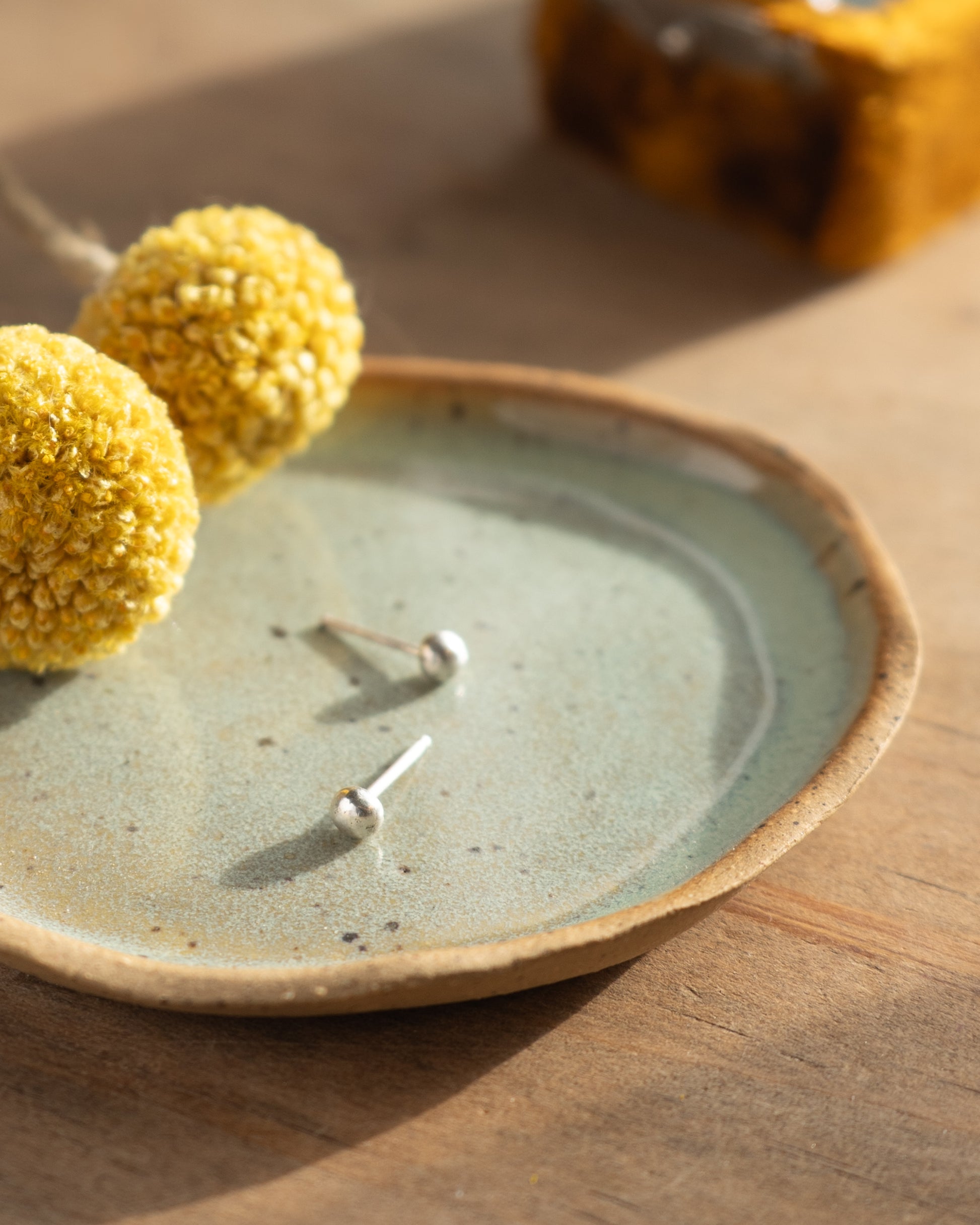 A pair of ball studs handmade from recycled .925 sterling silver. Named after a smooth stone that’s been rounded in a natural weathering process usually by water. The raw shape mimics the journey it’s been on in nature. Like a pebble the recycled metal carries stories of many pieces before.