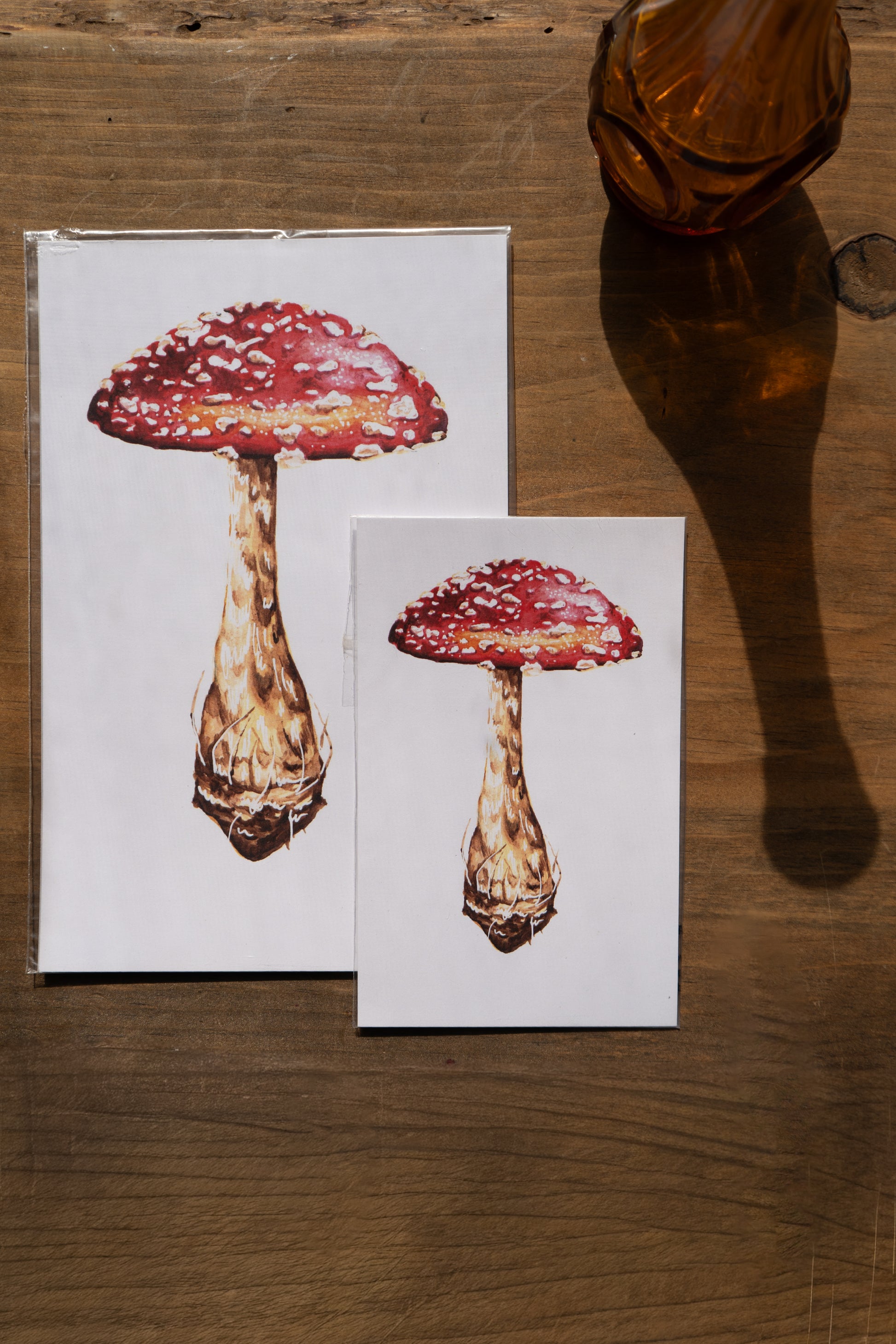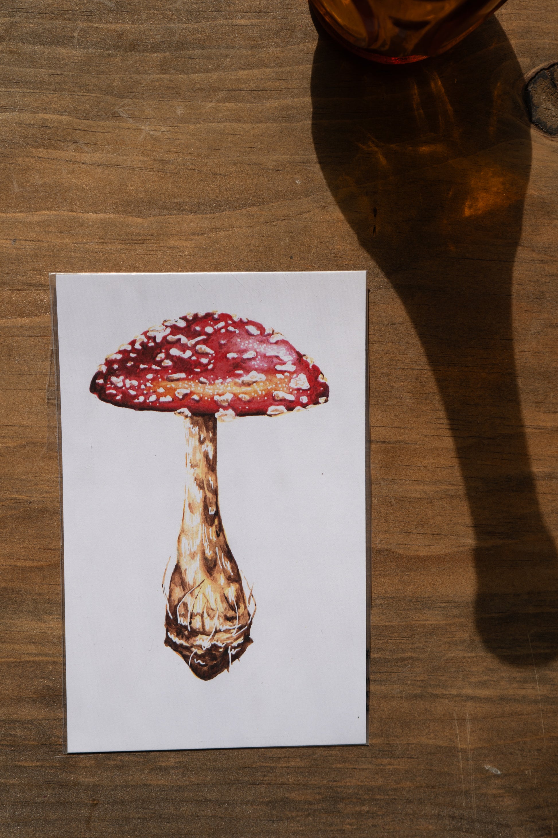 A colored pencil drawing of a red-capped mushroom, full of texture and rich tone. The vibrant cap contrasts with the softer details of the stem, giving the piece both warmth and depth. Simple yet striking, it’s a celebration of the small but powerful beauty found in nature.