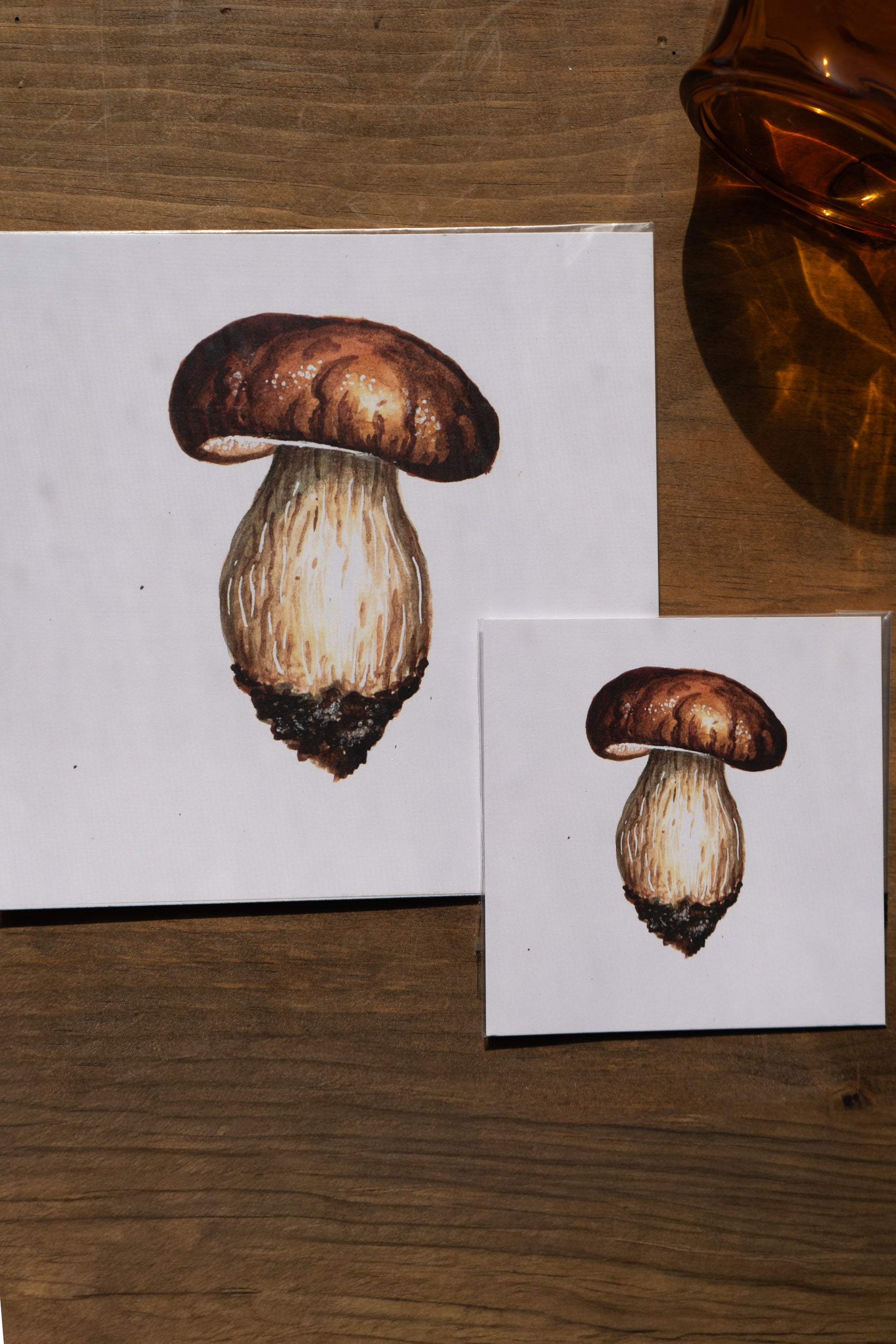 A watercolor painting of a short, stocky mushroom with rich earthy tones. The thick stem and rounded cap give it character and presence, celebrating the small, grounded beauty of nature. Soft washes of color and subtle shading make it feel alive while keeping a playful, approachable charm.