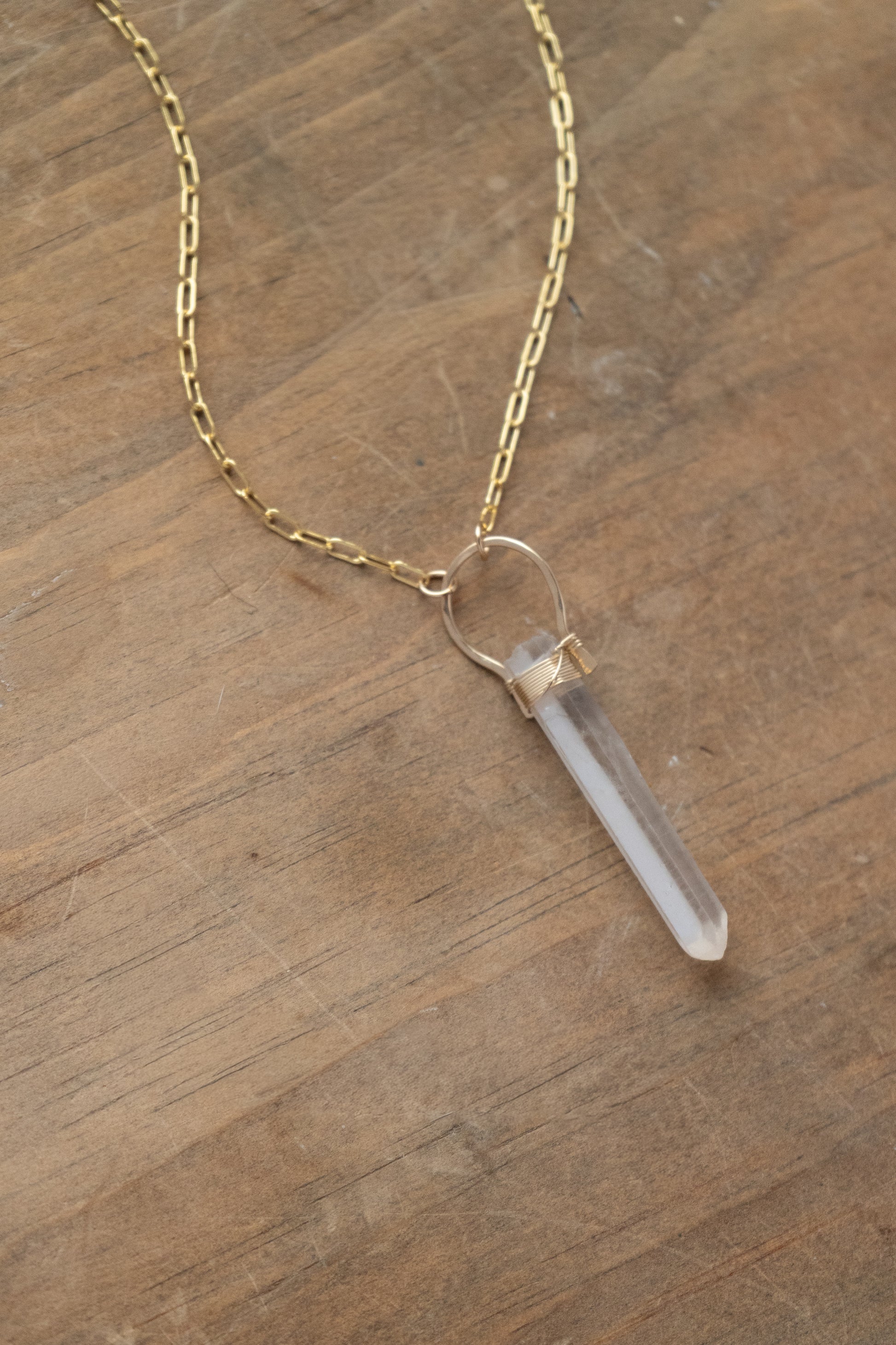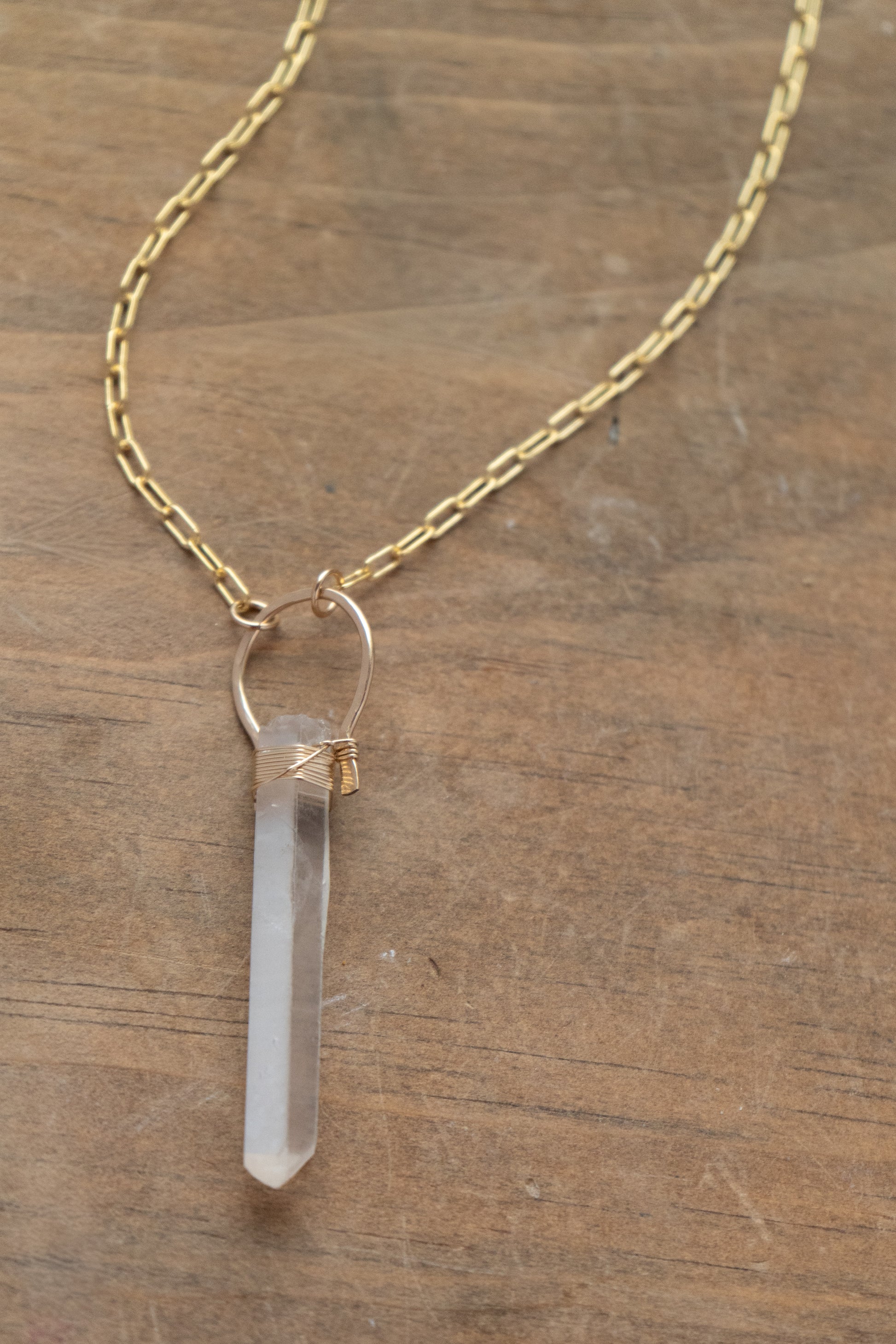 A clear quartz statement to wear as an everyday cleanser. Wire wrapped onto an 20” chain.