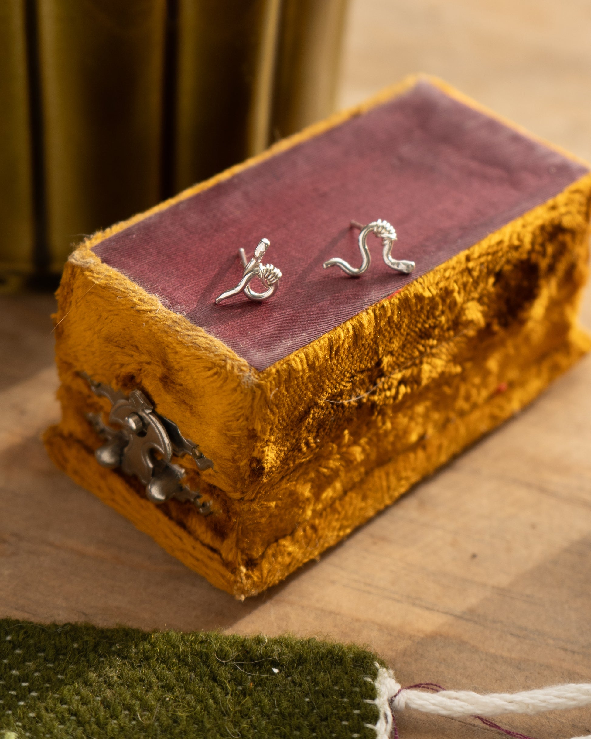 A tiny pair of asymmetrical worm studs, sculpted by hand in .925 sterling silver. These worms symbolize resilience and rebirth, honoring the creatures that reshape the earth and remind us that transformation is a continuous journey.